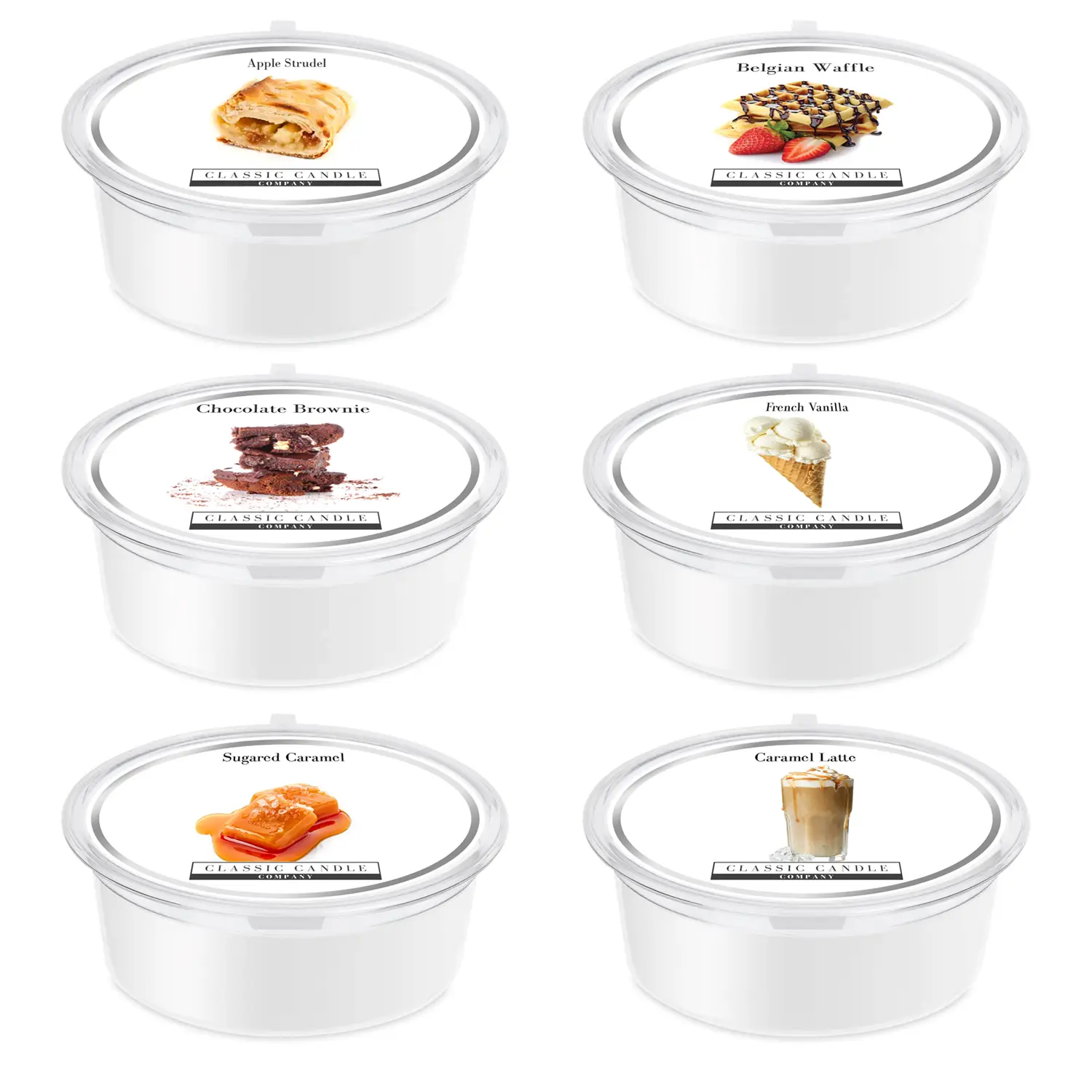 6 Treats MiniPot Collection : 6 Treats Minipot Collection : Enjoy a collection of six Foody Treat MiniPot Wax Melts!Caramel Latte, Sugared Caramel, French Vanilla, Chocolate Brownie, Belgian Waffle, Apple Strudel